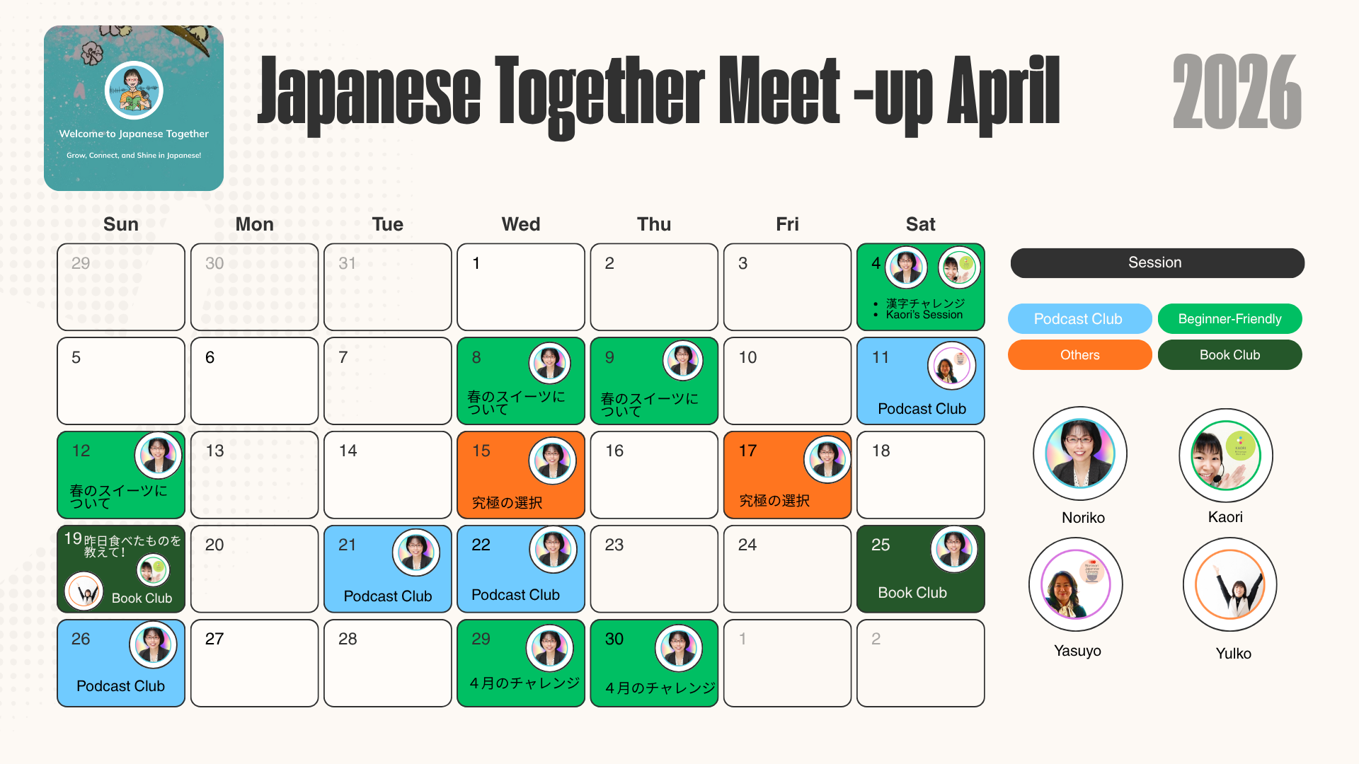 We also have special sessions including our Book Club and weekend meet-ups hosted by Noriko, running 45 minutes for deeper conversations and genuine connection.